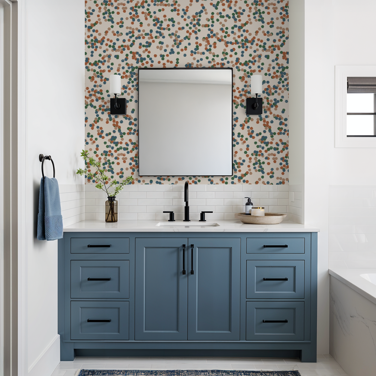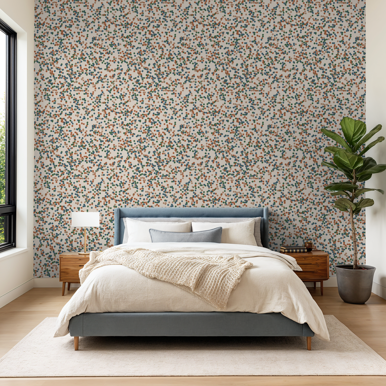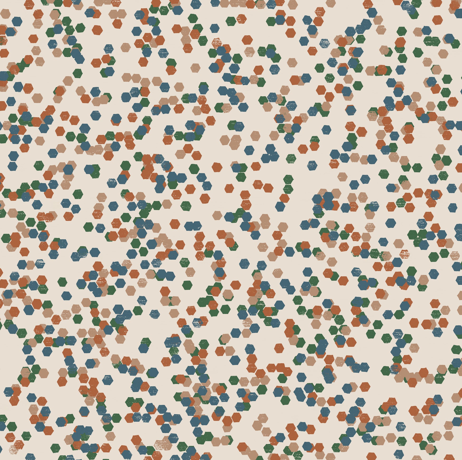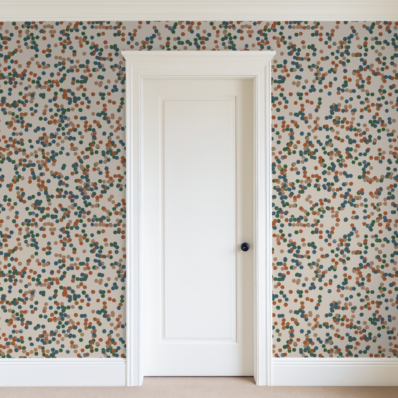 This playful wallpaper features scattered hex block pressed shapes. The organic spacing and varied hues create an easy sense of movement and texture, adding personality and something unique. Perfect for accent walls, creative studios, or any space that calls for a touch of fun.