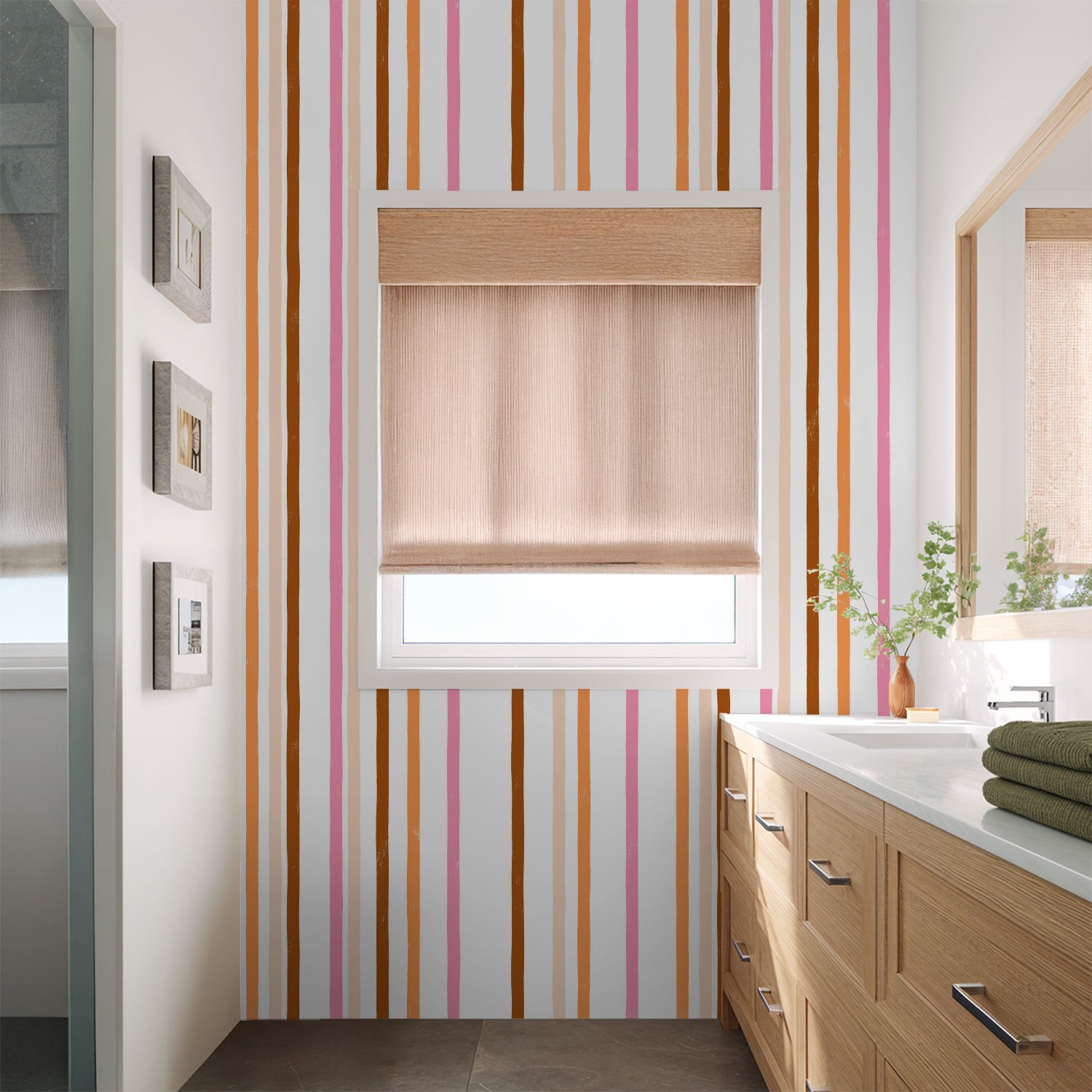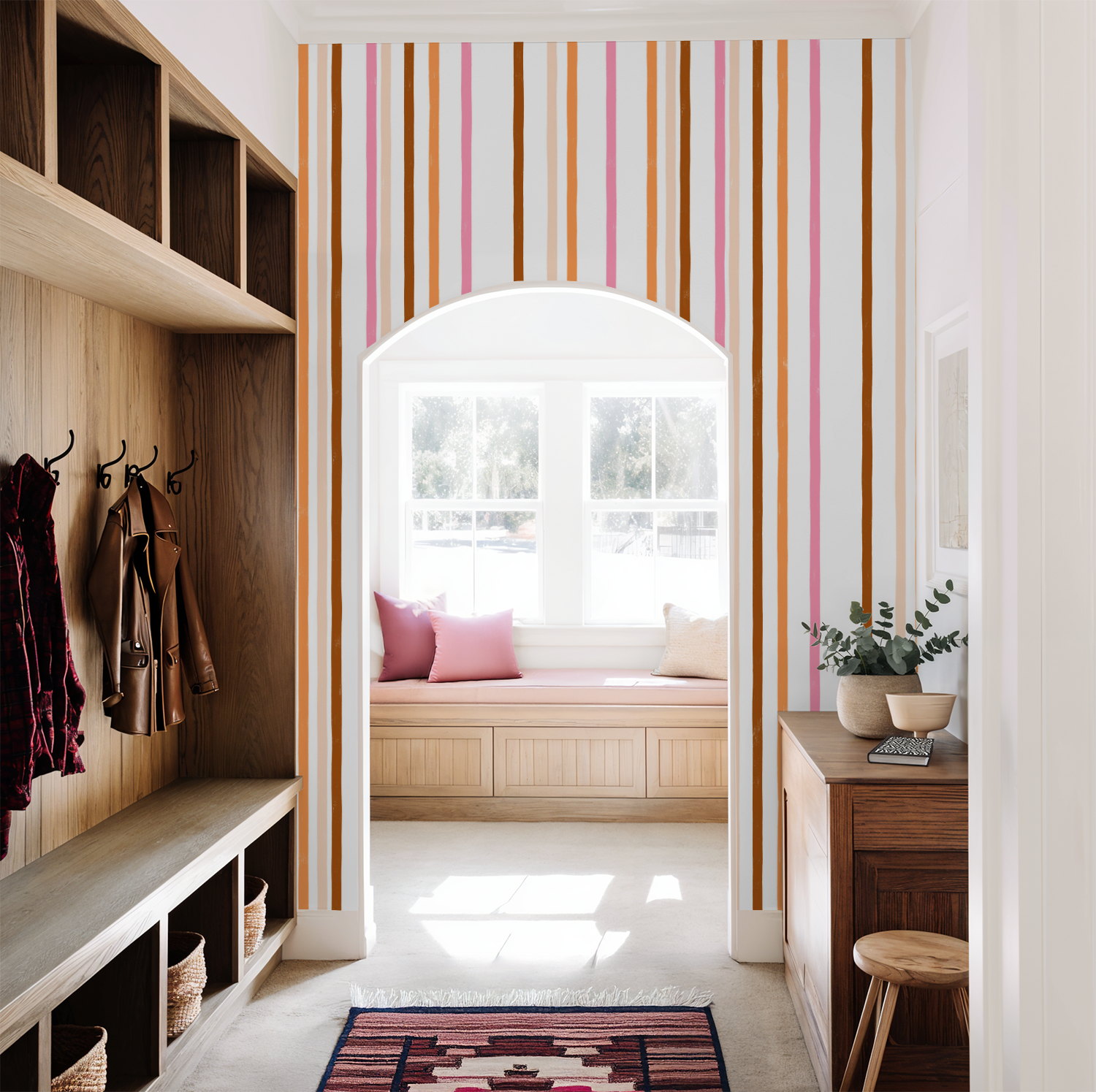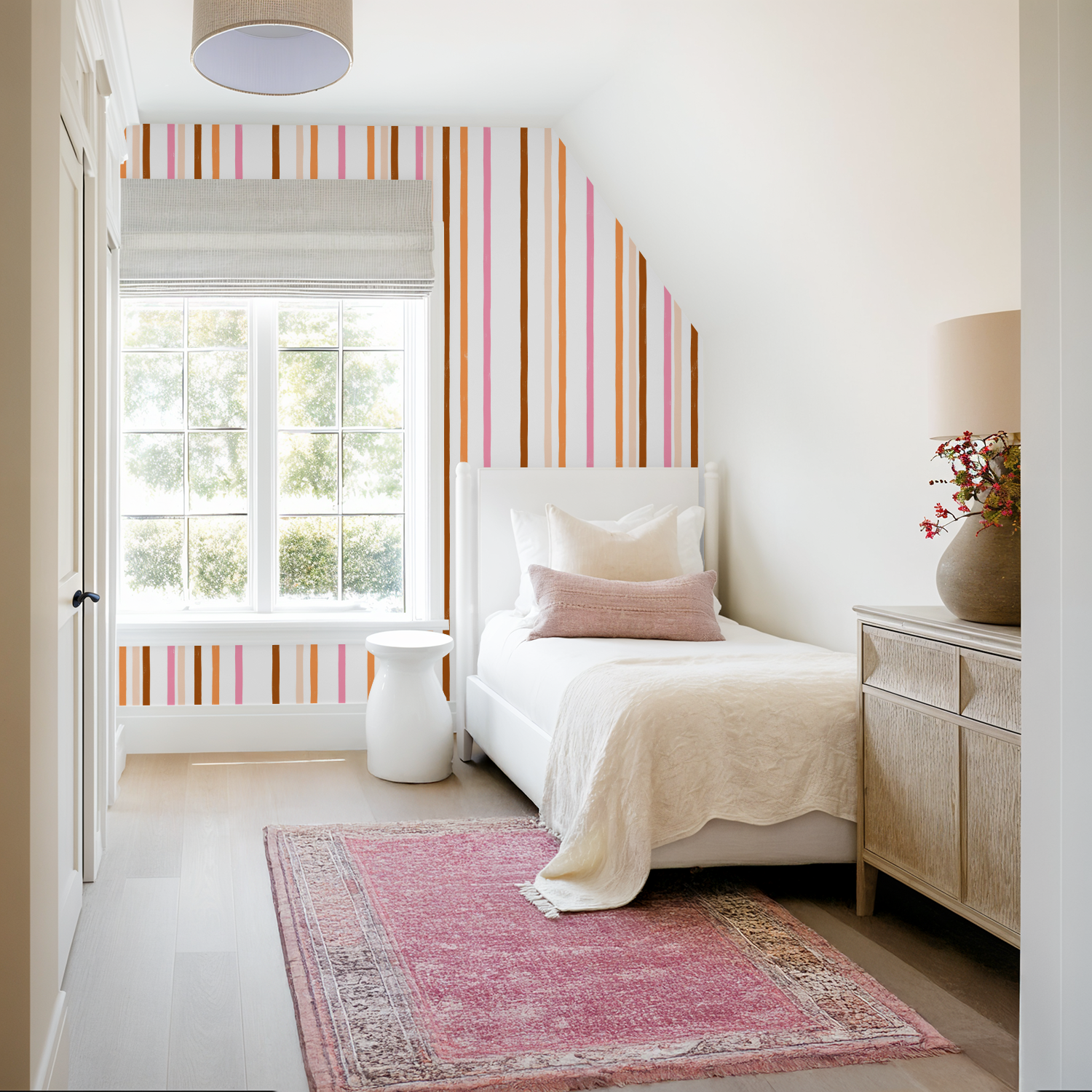 Fresh and inviting, this playful stripe design blends vibrant colors that helps set the tone of any space. Perfect for bedrooms and feature walls.