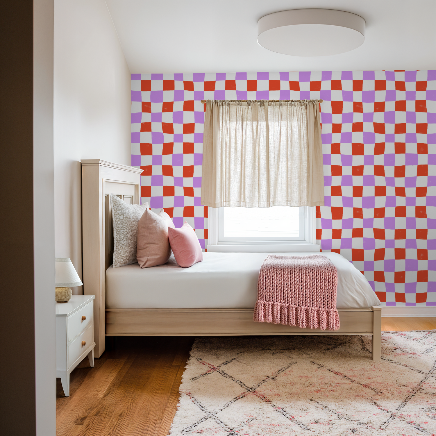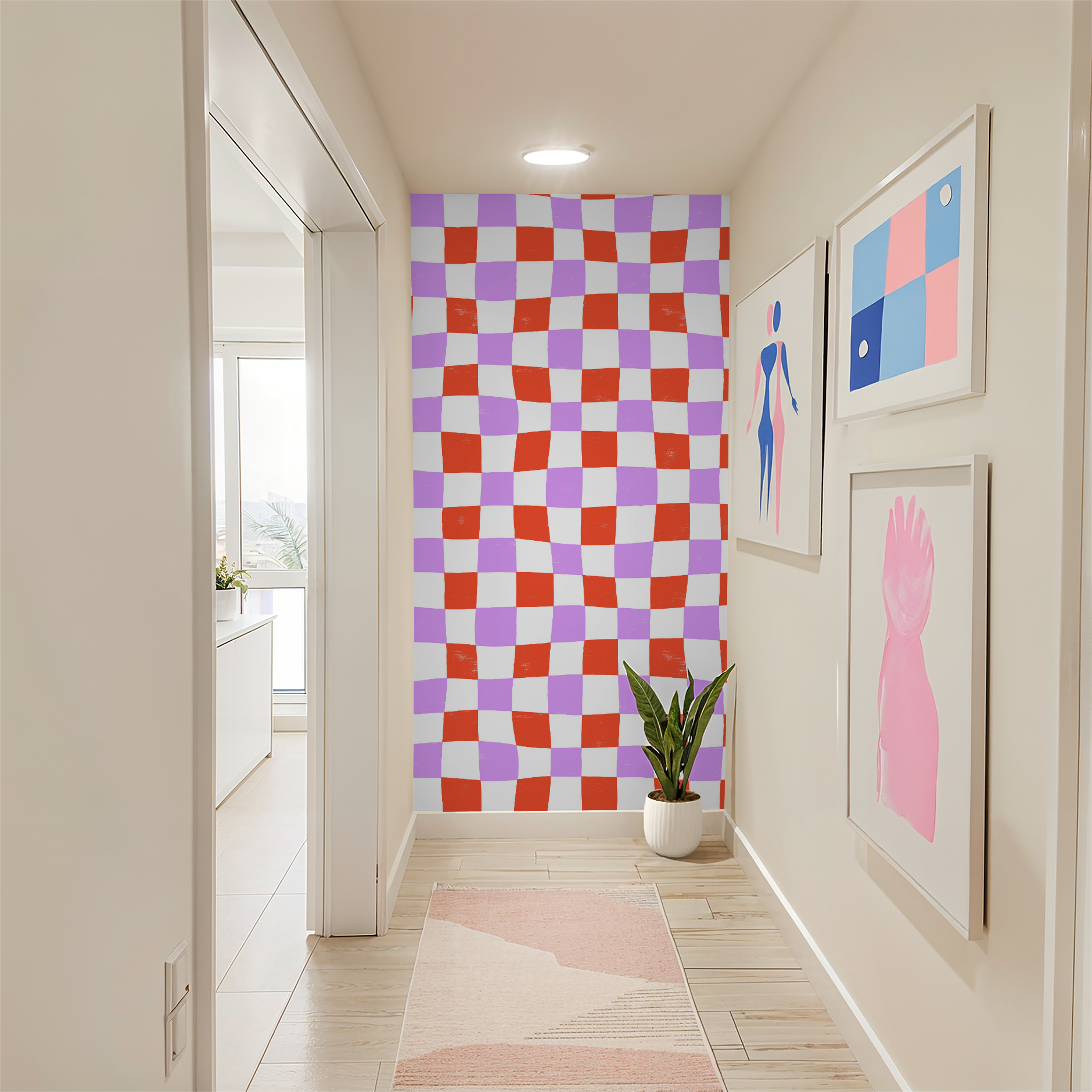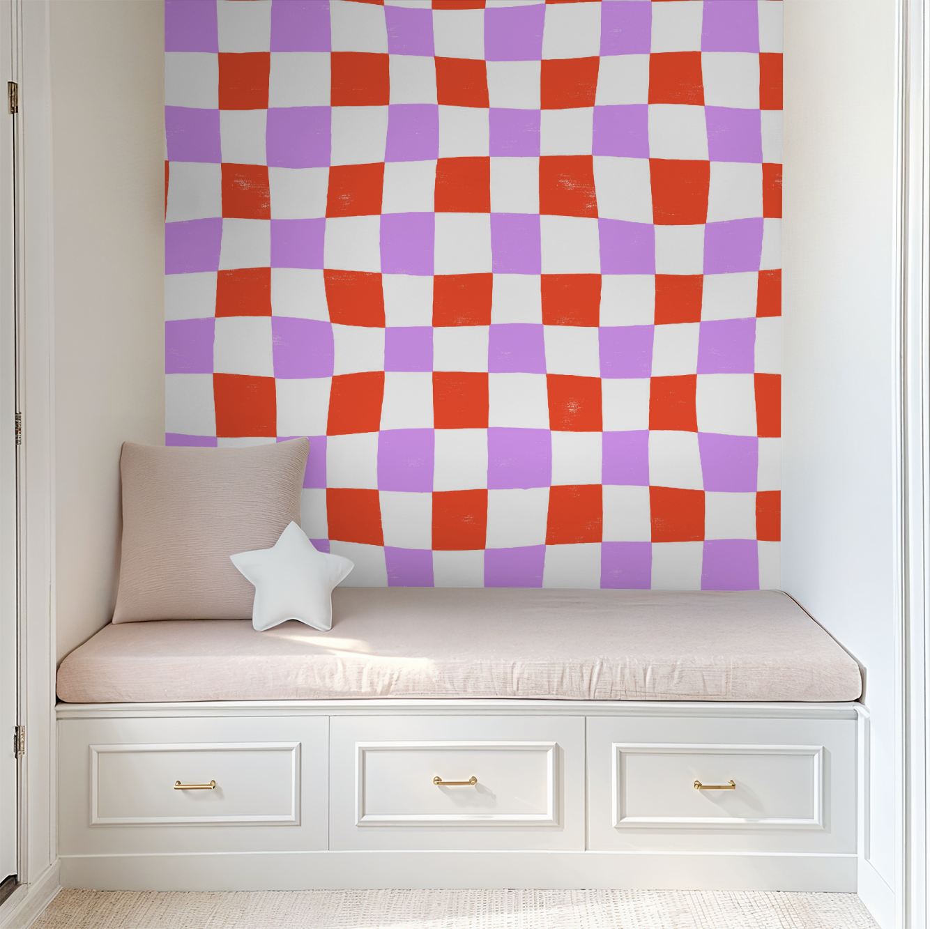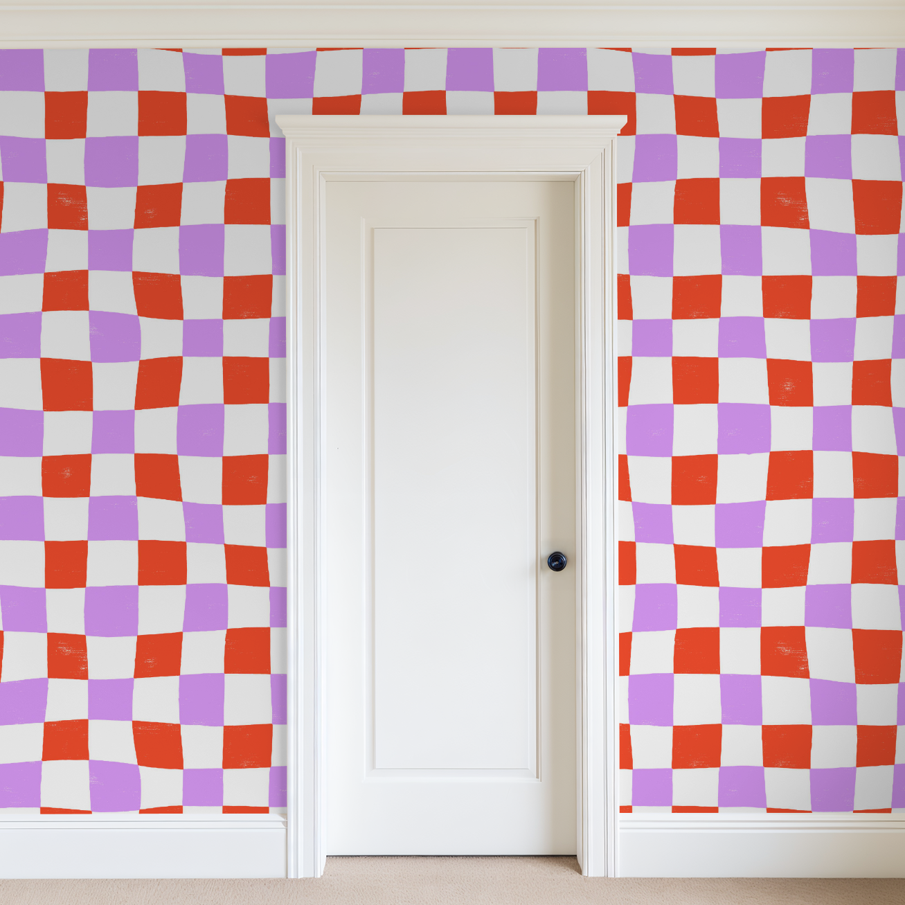Playful and bold, this wavy check wallpaper reimagines the classic checkerboard with a distorted twist. Perfect for creative spaces, or anyone who loves a touch of energy with a artistic edge.